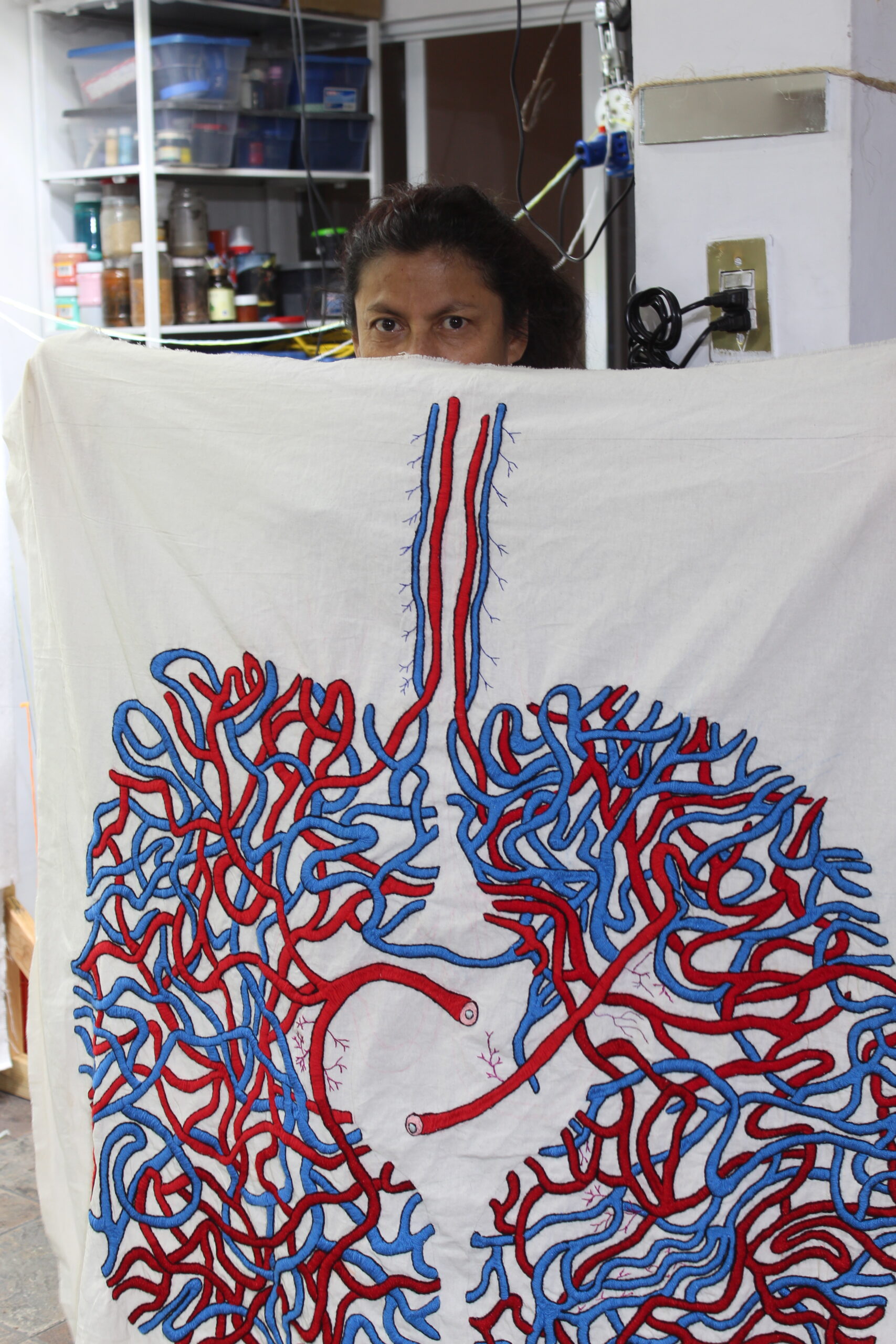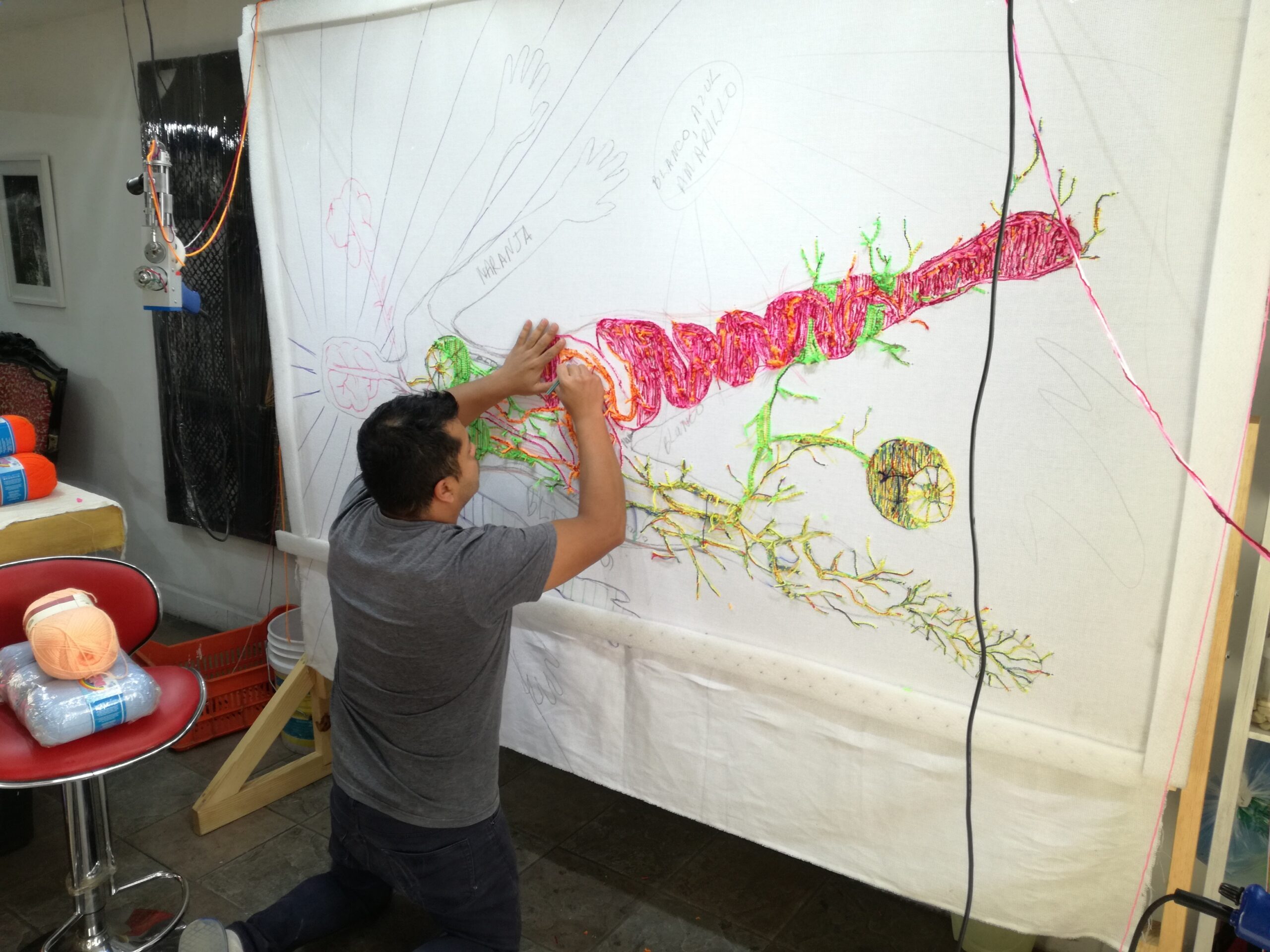 The artist presented “The body as a Container” which is part of a Relational collaboration of embroidered textiles, which he has developed for more than 12 years with his own family, (mother, brother, father, nieces, grandmother, aunts, etc.), where he explores his own family context, his identity, his roots, collaborating openly and including them in the process of each of the pieces making this a rule to be able to present a new embroidery. This open series will continue until the day of Santos’ death. She also explores traditional techniques of Latin American embroidery, while investigating the body as a container for emotions (Guattari) and her own illnesses and psychic processes by altering human anatomy and creating new body patterns. The collaboration began with his own mother in 2008 and from there it expanded to his most direct family, until reaching Chiapas, Veracruz and Guatemalan communities looking for their origins and identity through the family fabric.