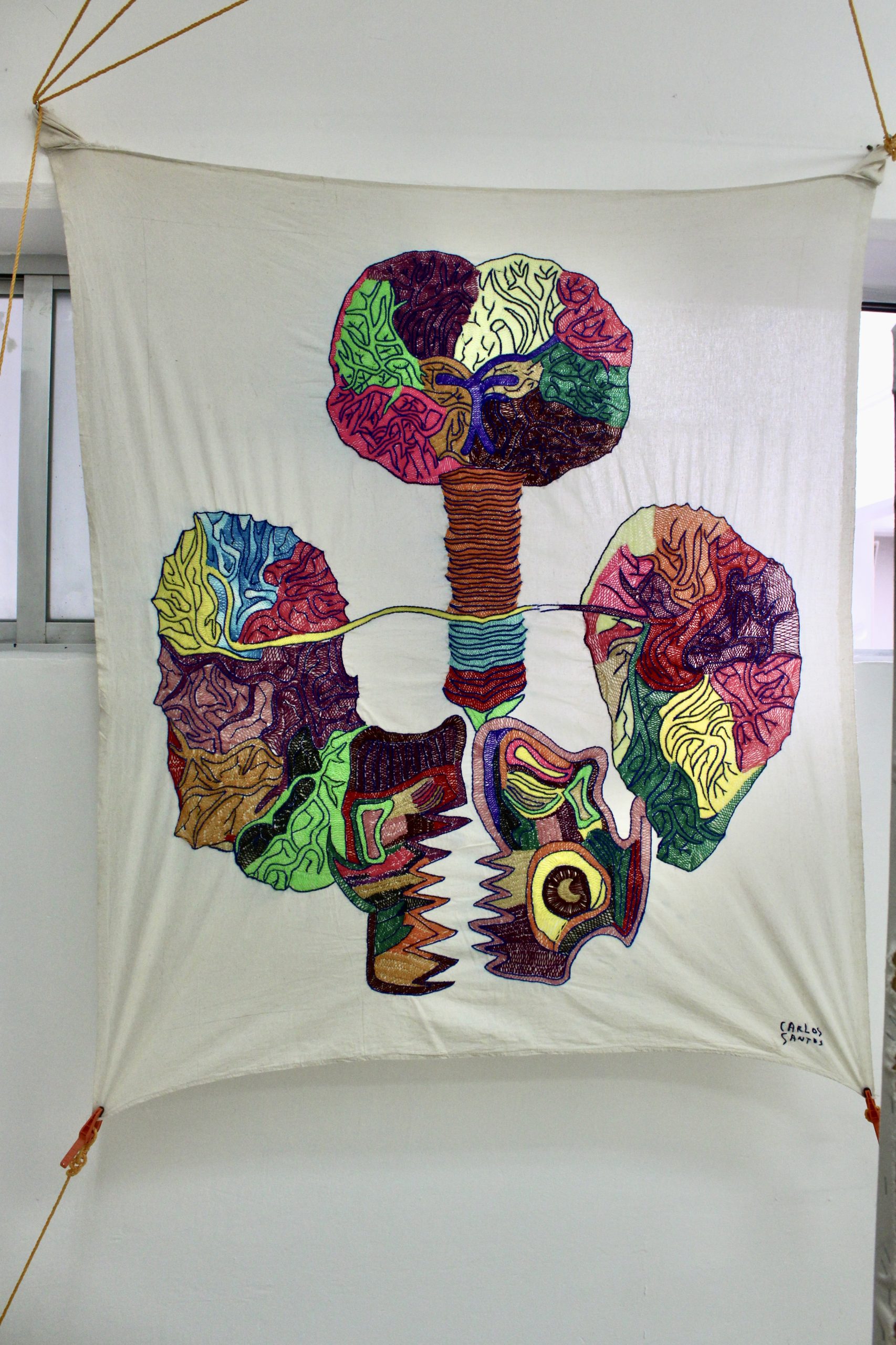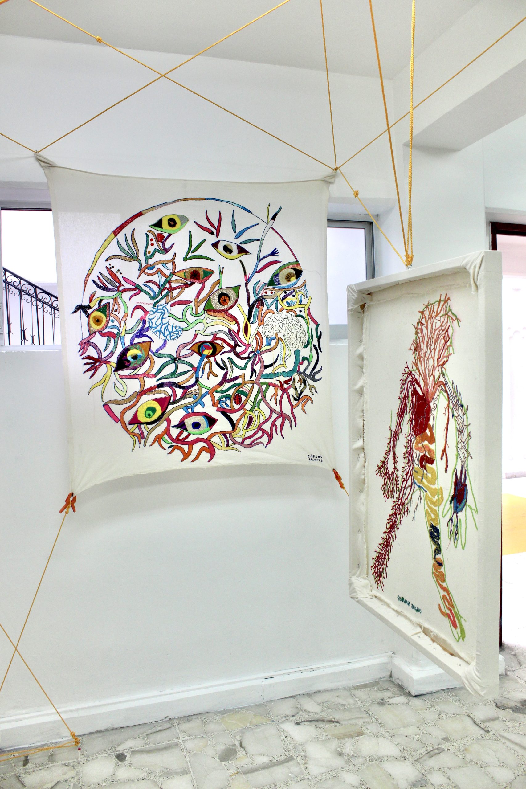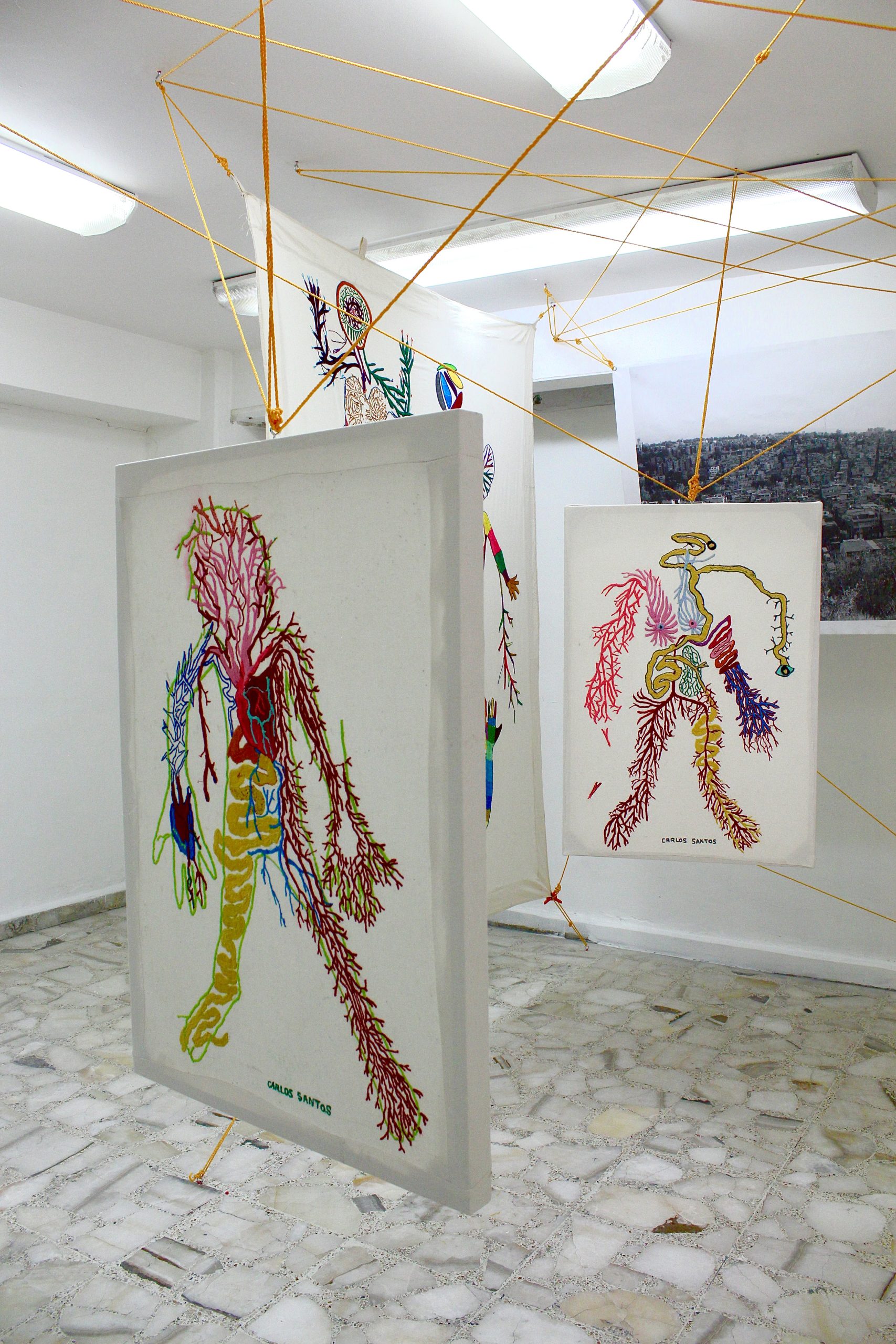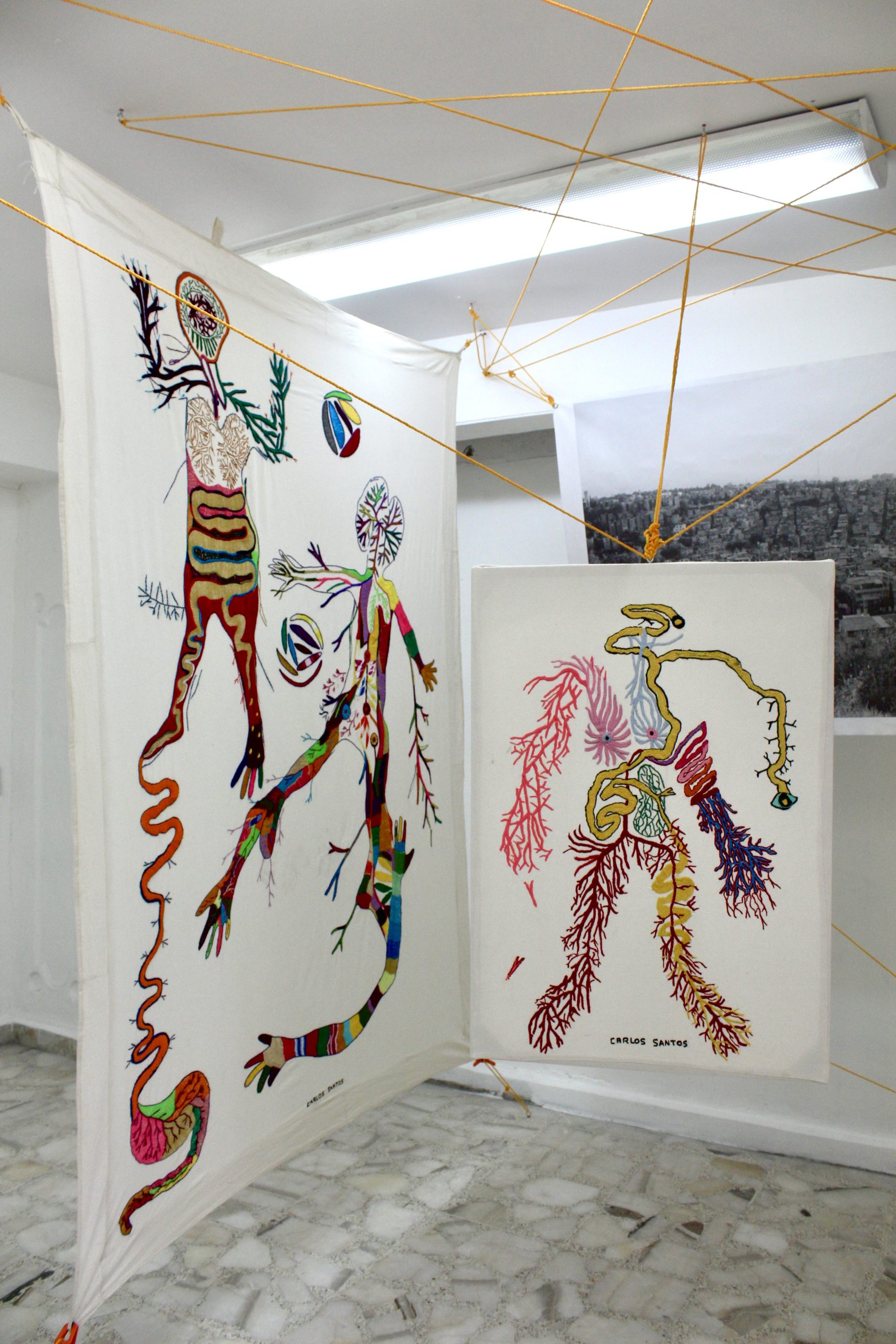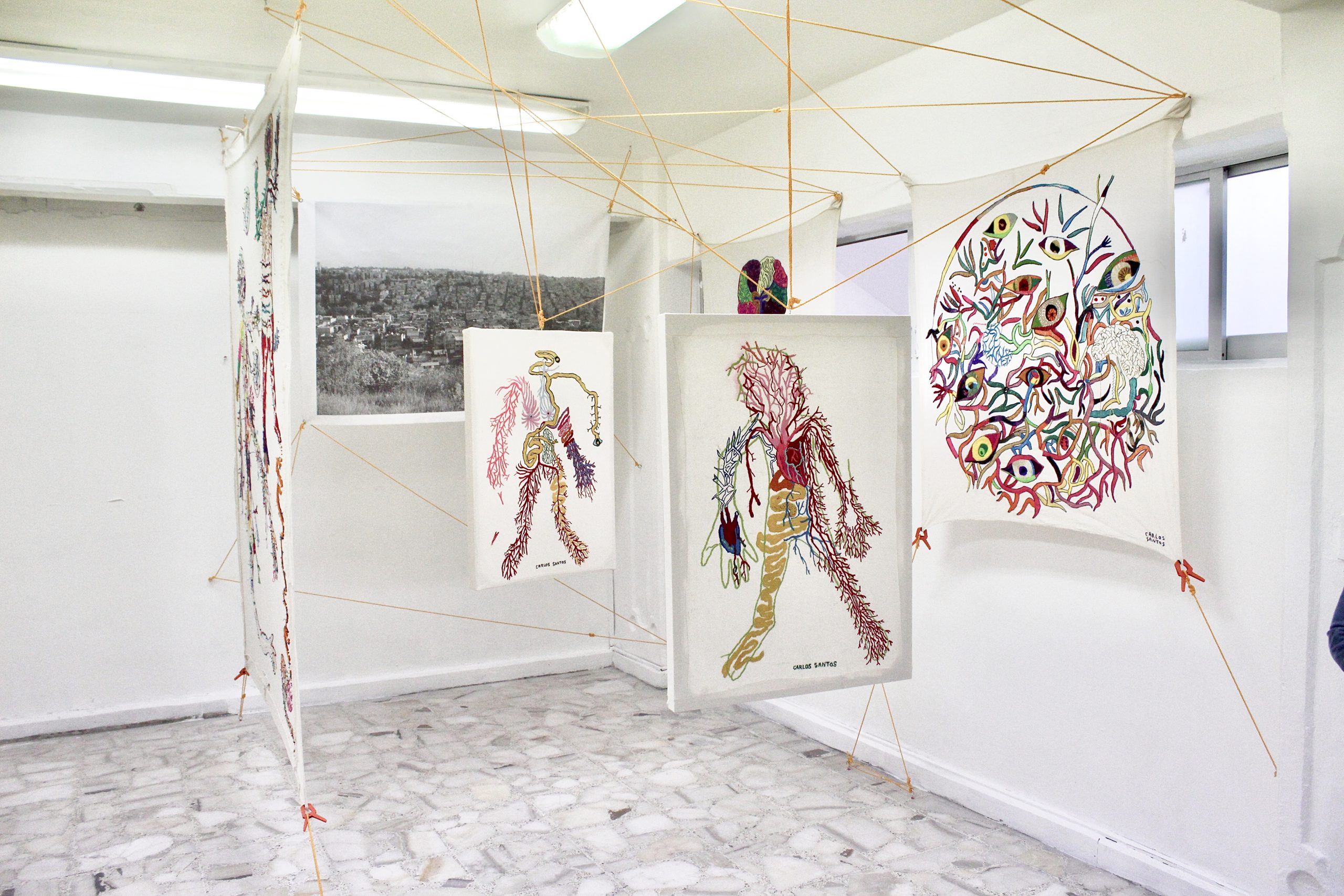 This project was awarded the prize of the fair to the most outstanding stands for its proposal and conceptual solids, as well as to the installation itself, where Carlos Santos wove with a bow all the embroidered textiles, together with a large-format photograph printed on fabric, which refers to its most immediate social context, its colony Urban Development and town of Santa Fe in CDMX, seen from a mountain where the agglomeration of the houses is perceived where it seems that there is no room for one more, articulating everything as a social, corporal and at the same time habitable fabric by weaving the exhibition space together by a spider web referring to family ties and connections and that directly evokes the work A mile of thread, made by Marcel Duchamp in New York, in 1942, for the exhibition First Papers of Surrealism, The work consisted of an installation of threads that wrapped and crossed the space like cobwebs, effectively preventing the passage of the public and that it could contemplate the rest of the exhibited pieces.