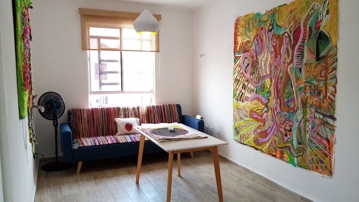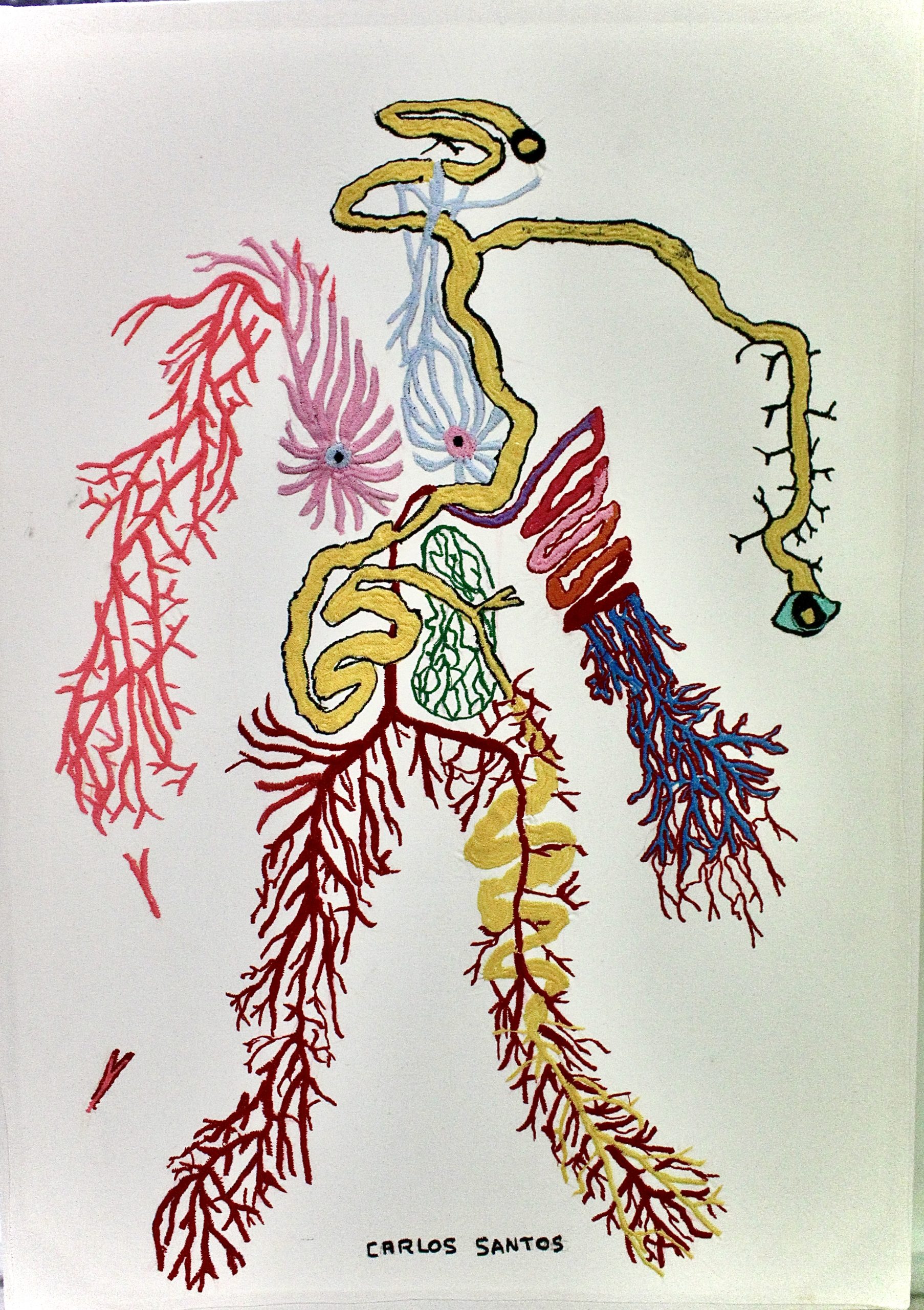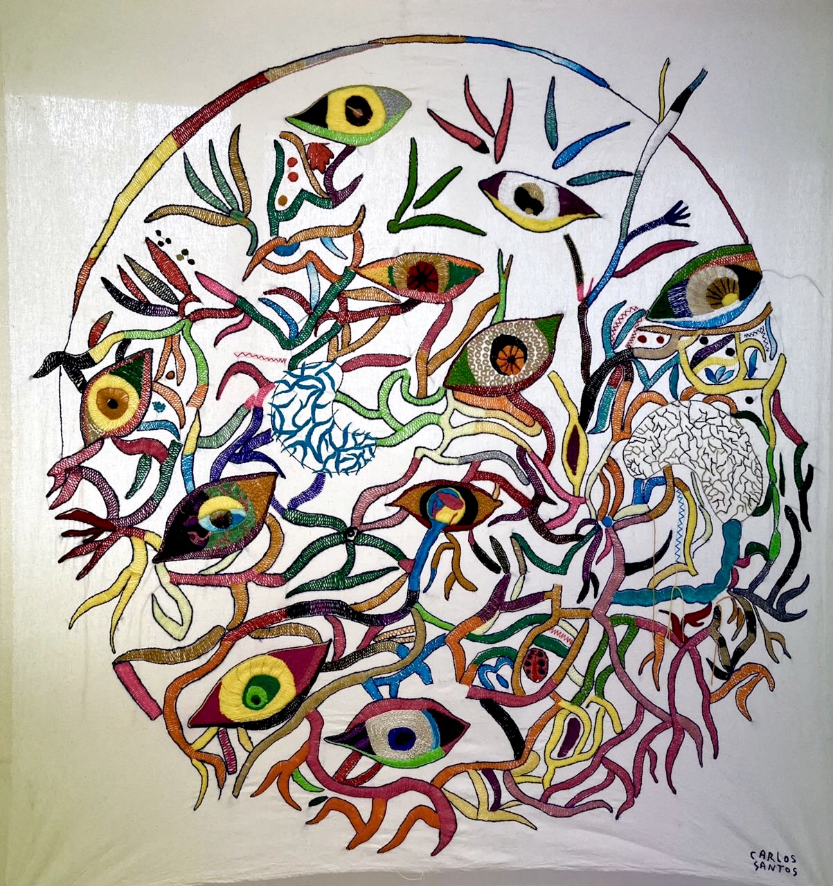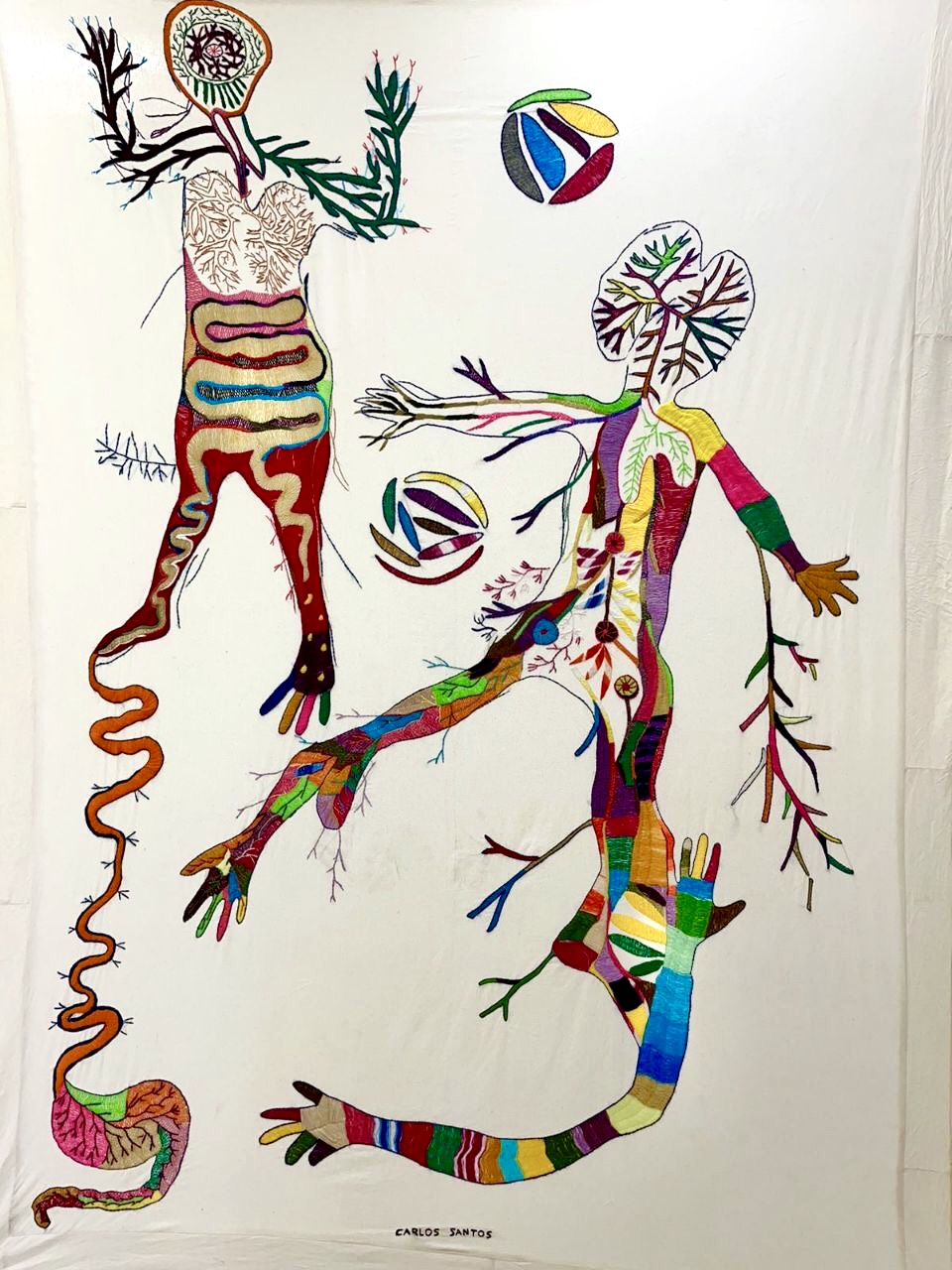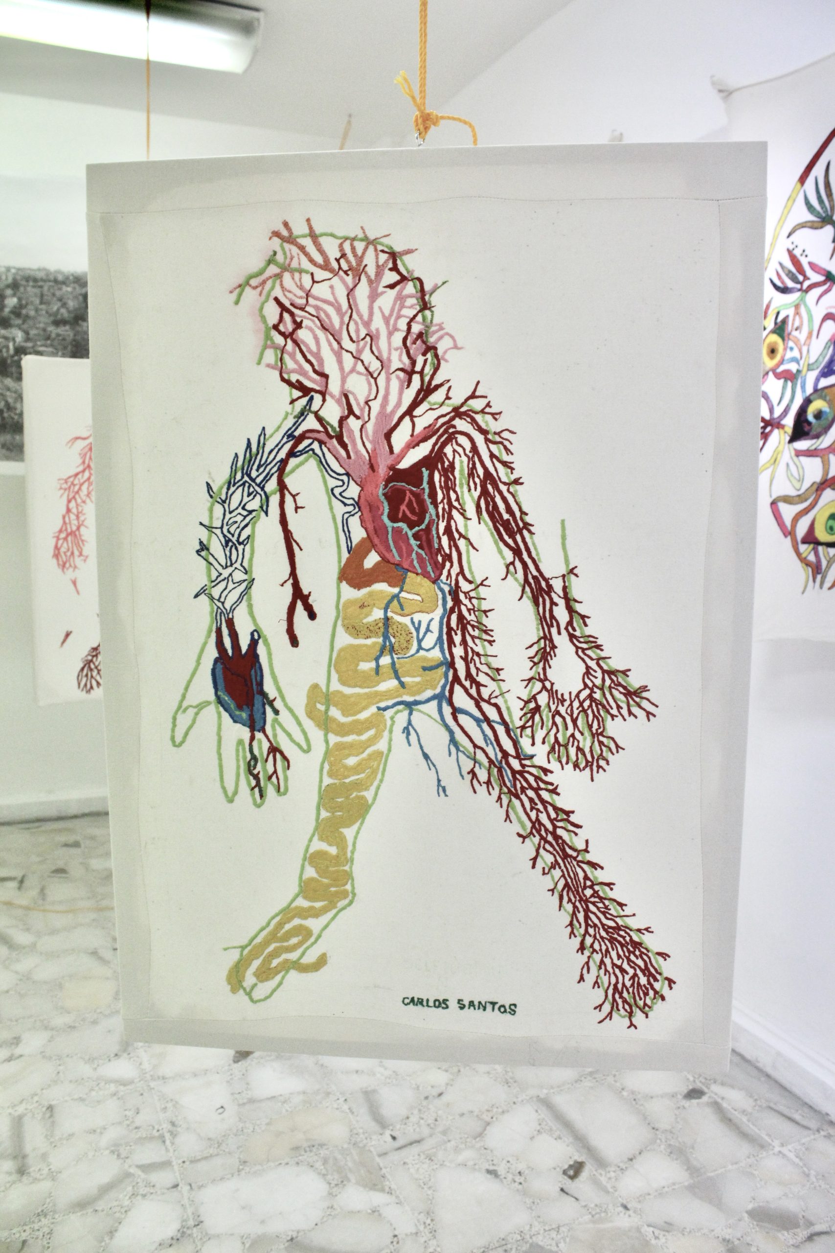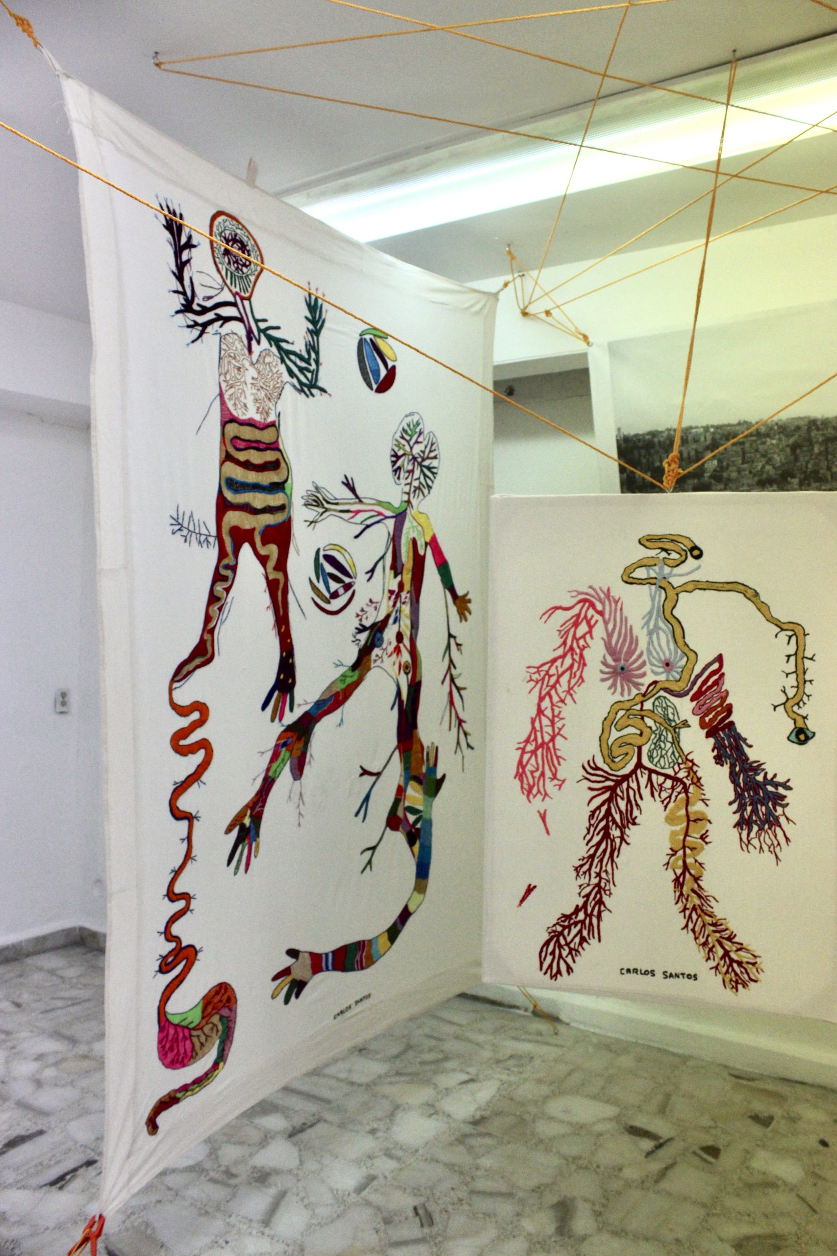 This project was awarded the prize of the fair to the most outstanding stands for its proposal and conceptual solids, as well as to the installation itself, where Carlos Santos wove with a bow all the embroidered textiles, together with a large-format photograph printed on fabric, which refers to its most immediate social context, its colony Urban Development and town of Santa Fe in CDMX, seen from a mountain where the agglomeration of the houses is perceived where it seems that there is no room for one more, articulating everything as a social, corporal and at the same time habitable fabric by weaving the exhibition space together by a spider web referring to family ties and connections and that directly evokes the work A mile of thread, made by Marcel Duchamp in New York, in 1942, for the exhibition First Papers of Surrealism, The work consisted of an installation of threads that wrapped and crossed the space like cobwebs, effectively preventing the passage of the public and that it could contemplate the rest of the exhibited pieces.