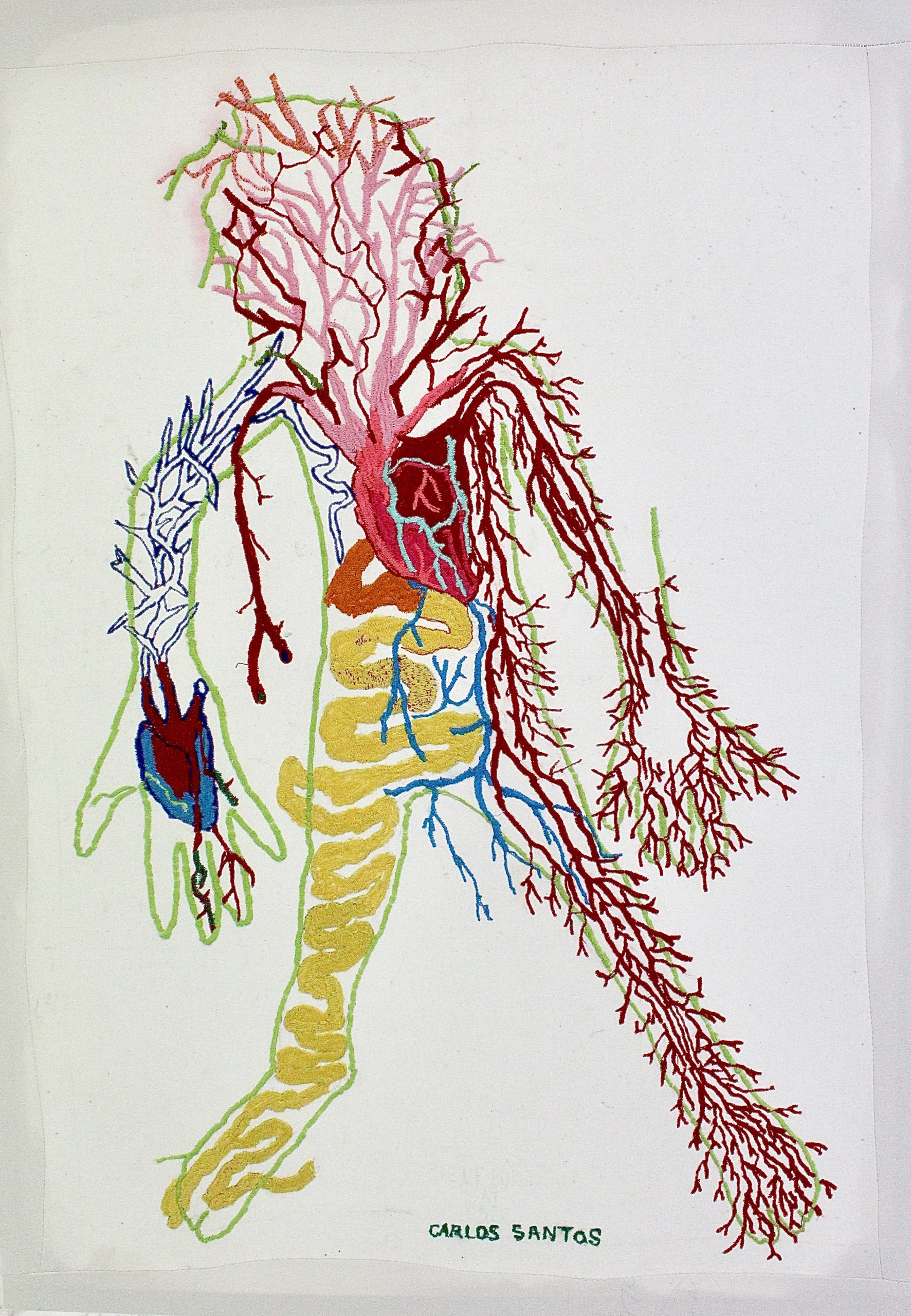 El artista presentó “The body as a Container” la cual parte de una colaboración Relacional de textiles bordados, que ha desarrollado desde hace más de 12 años con su propia familia, (madre, hermano, padre, sobrinas, abuela, tías, etc.), donde explora su propio contexto familiar, su identidad, sus raíces, colaborando abiertamente e incluyéndolos en el proceso de cada una de las piezas haciendo esta una regla para poder presentar un nuevo bordado. Esta serie abierta se seguirá haciendo hasta el día de la muerte de Santos. También explora técnicas tradicionales del bordado latinoamericano, al mismo tiempo que investiga el cuerpo como contenedor de emociones (Guattari) y de sus propias enfermedades y procesos psíquicos al alterar la anatomía humana y crear nuevos patrones corporales. La colaboración comenzó con su propia madre en el año 2008 y de allí se fue expandiendo a su familia más directa, hasta llegar a comunidades chiapanecas, veracruzanas y guatemaltecas buscando sus orígenes e identidad a través del tejido familiar.